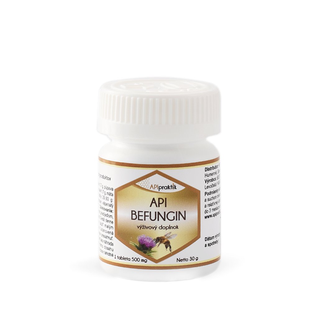 API Befungin je výživový doplnok vo forme tabliet, ktorý spája včelie a rastlinné zložky tradične využívané na podporu vitality organizmu. Obsahuje včelí obnôžkový peľ, extrakt z huby čaga (ryšavec šikmý), pestrec mariánsky a vitamín C.