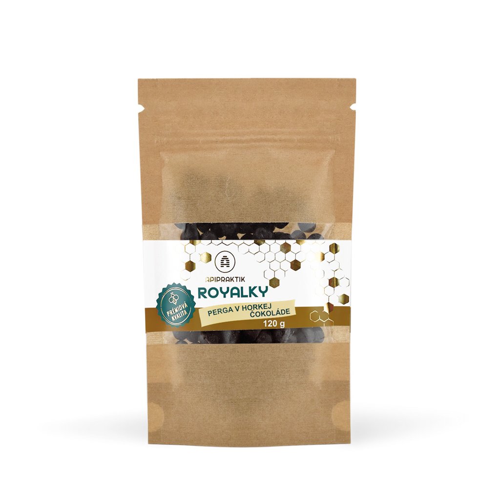 Royalky v horkej čokoláde sú výnimočné čokoládové dražé s pergou – fermentovaným včelím peľom, ktorý patrí medzi najvzácnejšie produkty úľa. Každá gulička je obalená v kvalitnej 72 % pravej talianskej horkej čokoláde, ktorá vytvára dokonalú rovnováhu chuti a pôžitku.